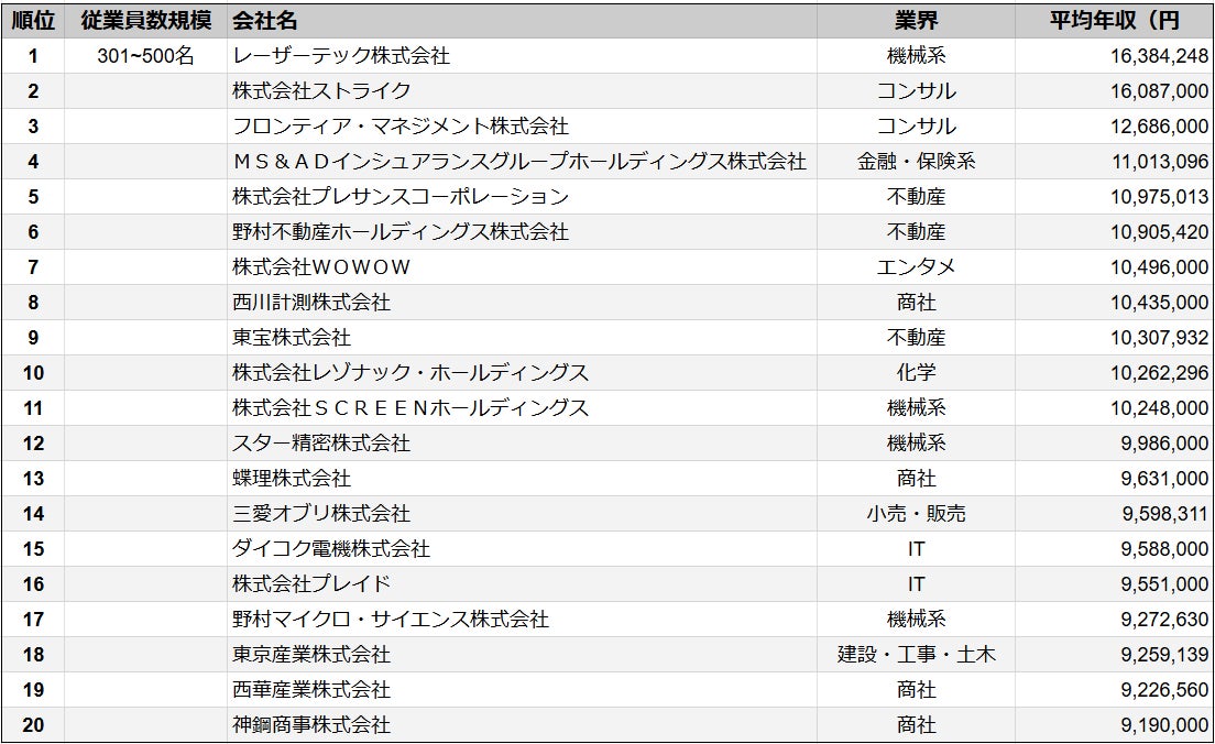 【2025年最新版】従業員数301~500名規模の上場企業 年収ランキングTOP20を発表/SalesNow DBレポート