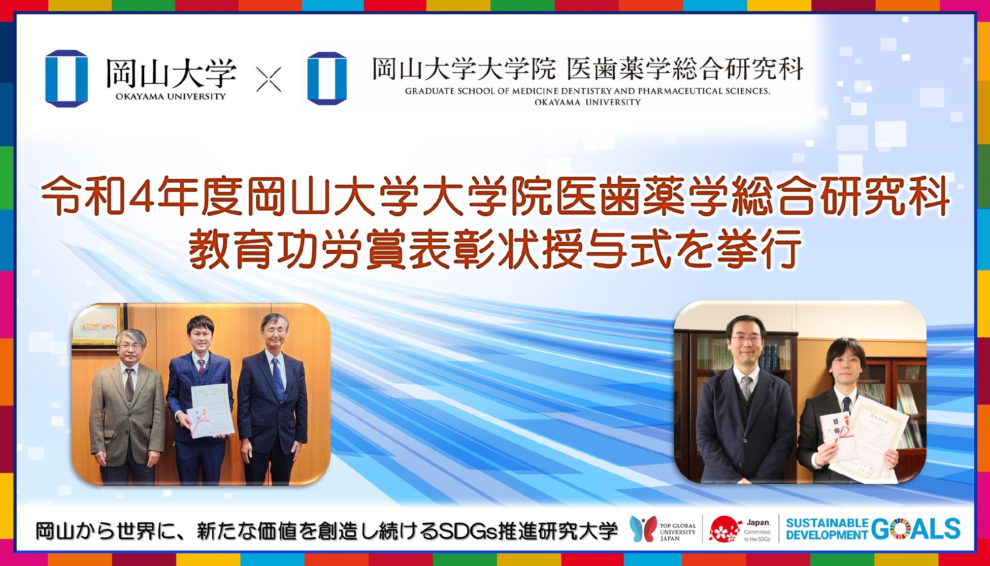 国立大学法人岡山大学(本部:岡山市北区、学長:槇野博史)の大学院医歯薬学総合研究科では、令和4年度大学院医歯薬学総合研究科教育功労賞表彰状授与式を2023年1月17日挙行し、個人2名が受賞しました。