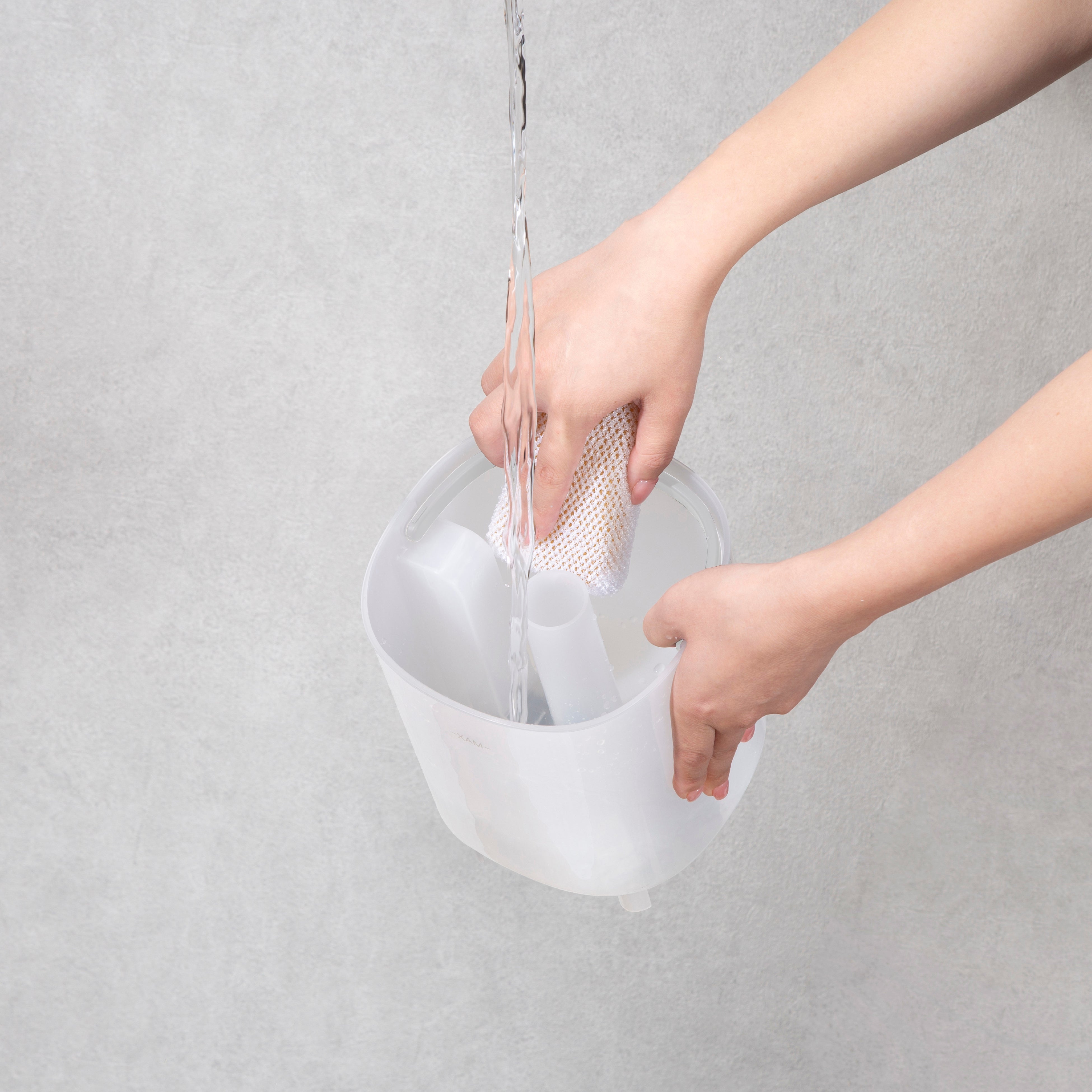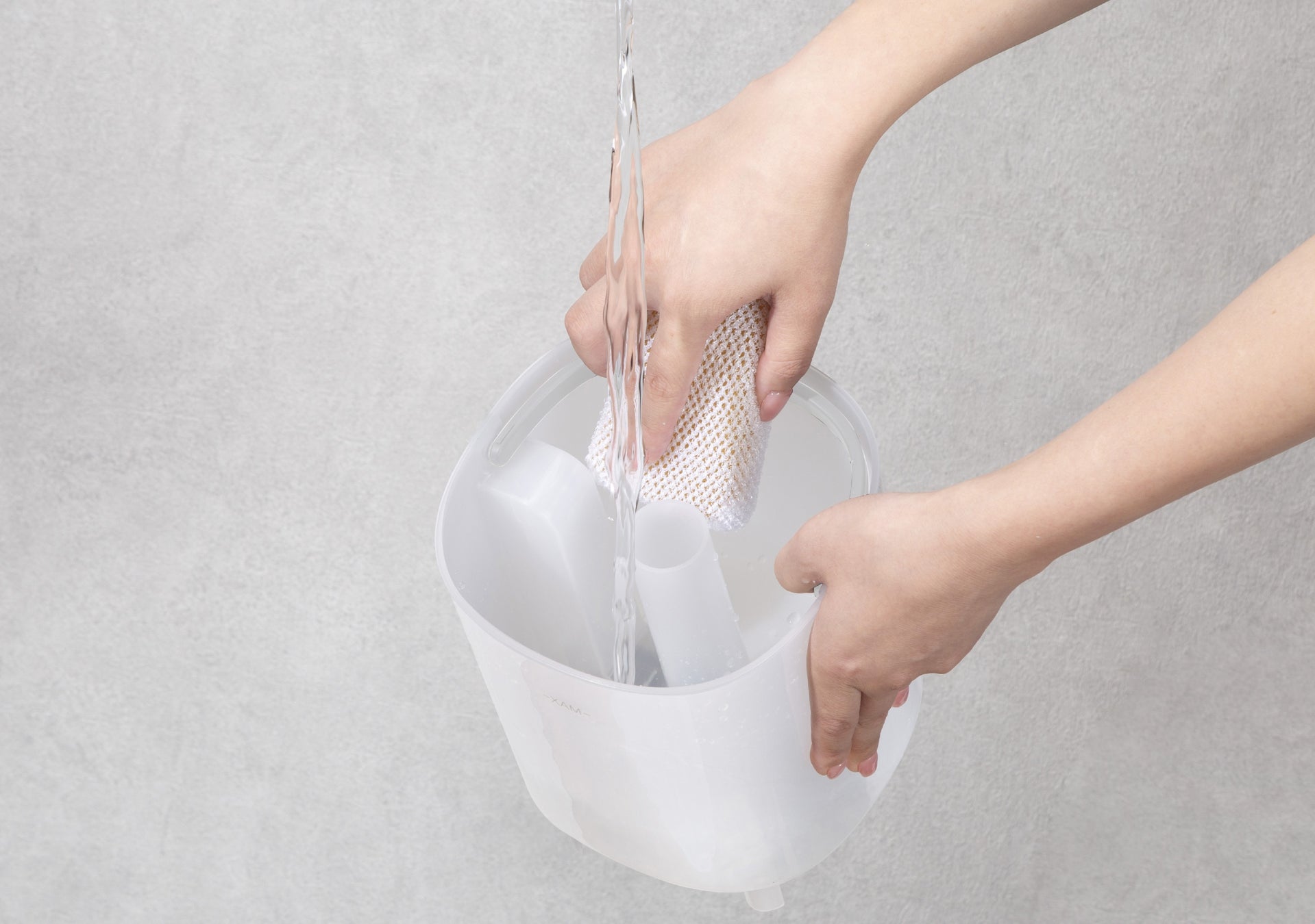 新商品は、ふたをあけずに上から直接給水できる利便性はそのままに、タンクを着脱してシンクや洗面台で給水することも可能になりました。使う場所や状況に応じて、2通りの給水方法を選べるので、便利にお使いいただけます。