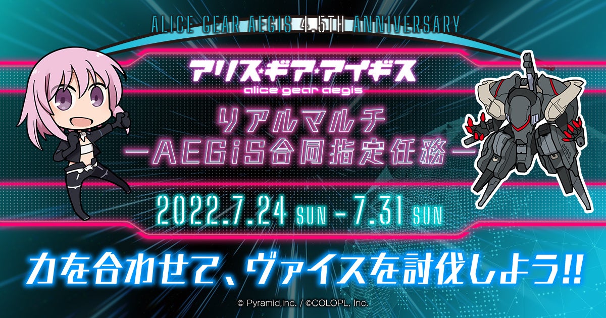 株式会社コロプラ(代表取締役社長:宮本貴志、本社:東京都渋谷区、以下「コロプラ」)は、本日2022年7月22日(金)、スマートフォン向けゲーム『アリス・ギア・アイギス(以下、アリスギア)』でサービス開始から4.5周年を迎えたことをお知らせします。これに合わせて、4.5周年を記念したアップデートを開催中です。