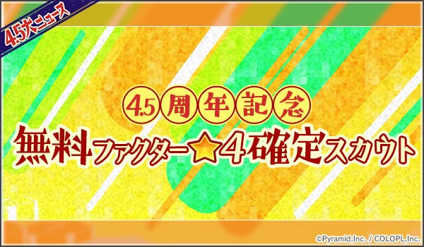 2022年7月22日(金)に4.5周年を迎えたことを記念して、最高レアリティのキャラが無料で獲得できる「無料ファクター★4確定スカウト」など、様々なアップデートを実施しております。