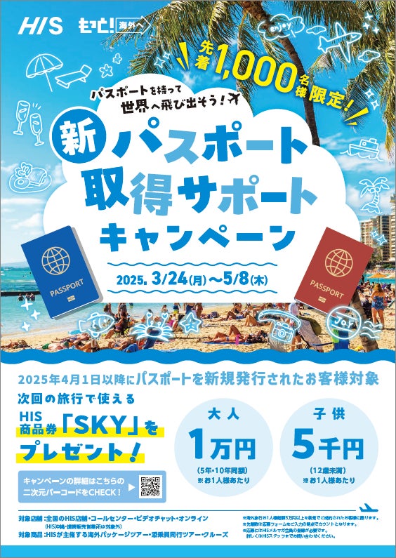 HISにて5万円以上の海外募集型企画旅行をお申込みの方で、2025年4月1日以降にパスポートを新規発行されたお客様を対象に、先着1,000名様に最大1万円※のHIS旅行券「SKY」をプレゼントします。