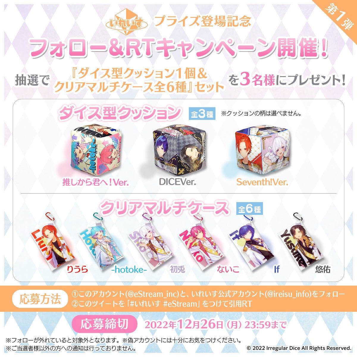 プライズ展開開始を記念し、Twitterキャンペーンにご参加頂いた方の中から、抽選3名様に『ダイスクッション1個&マルチケース全種』をプレゼントいたします。