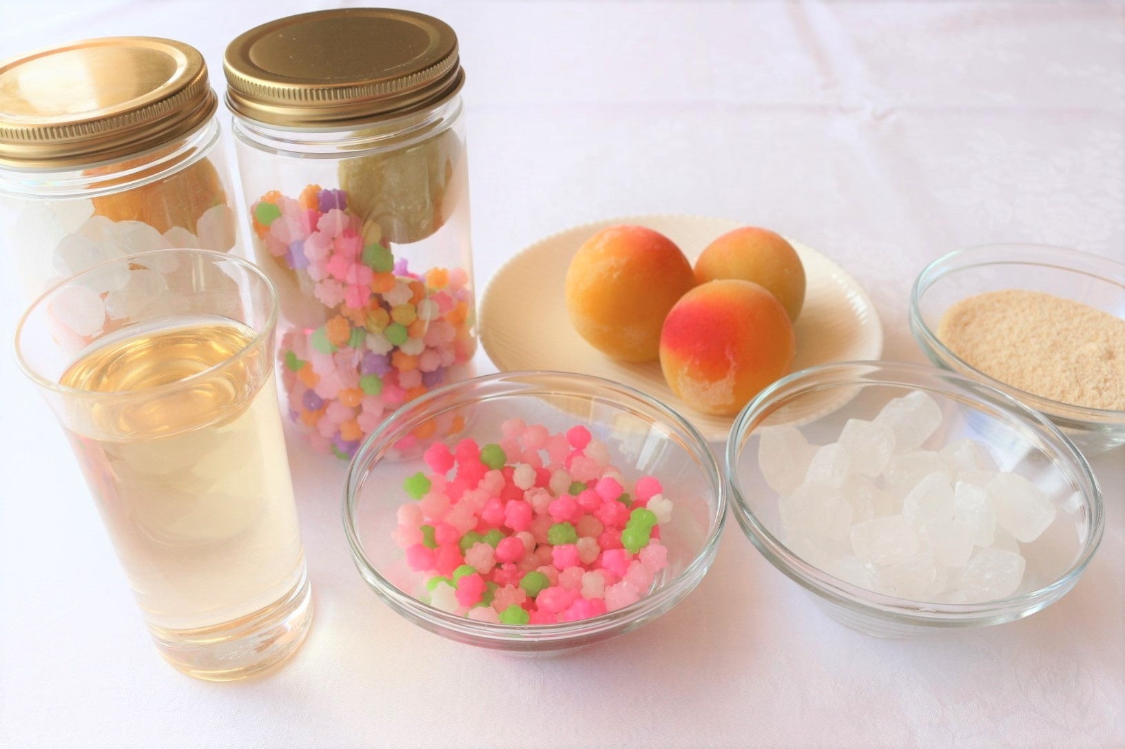 - 容器に梅と、お好みの砂糖(氷砂糖、きび砂糖、金平糖から1つをチョイス)を入れ完成。