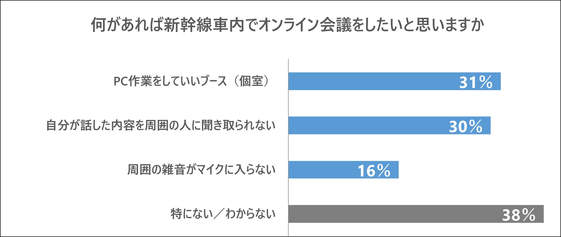 また、何があれば新幹線車内でオンライン会議をしたいと思うかという問い(※2)に対しては、「PC作業をしていいブース(個室)」や「自分が話した内容を周囲の人に聞き取られない」、「周囲の雑音がマイクに入らない」という回答が上位を占めており、音声に関する悩みが移動中のオンライン会議の障壁となっていることがわかりました。