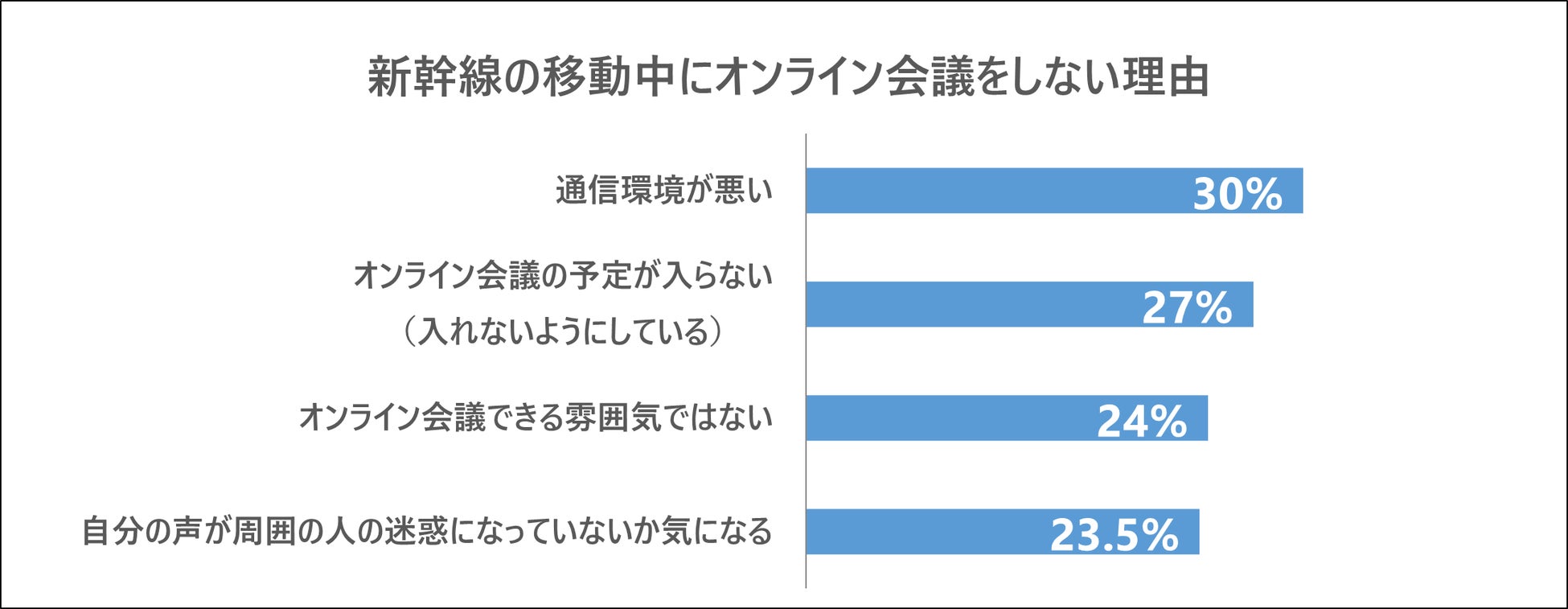 新幹線での移動中にオンライン会議をしない理由を具体的に確かめるため、アンケート調査を実施したところ(※2)、そもそも移動中にオンライン会議の予定を入れないようにしている人が多いことがわかりました。また自分の声が周囲の迷惑になっていないかを気にする声も多くあったことから、周囲の環境への配慮のためオンライン会議の予定を入れないようにしている人も多いのかもしれません。