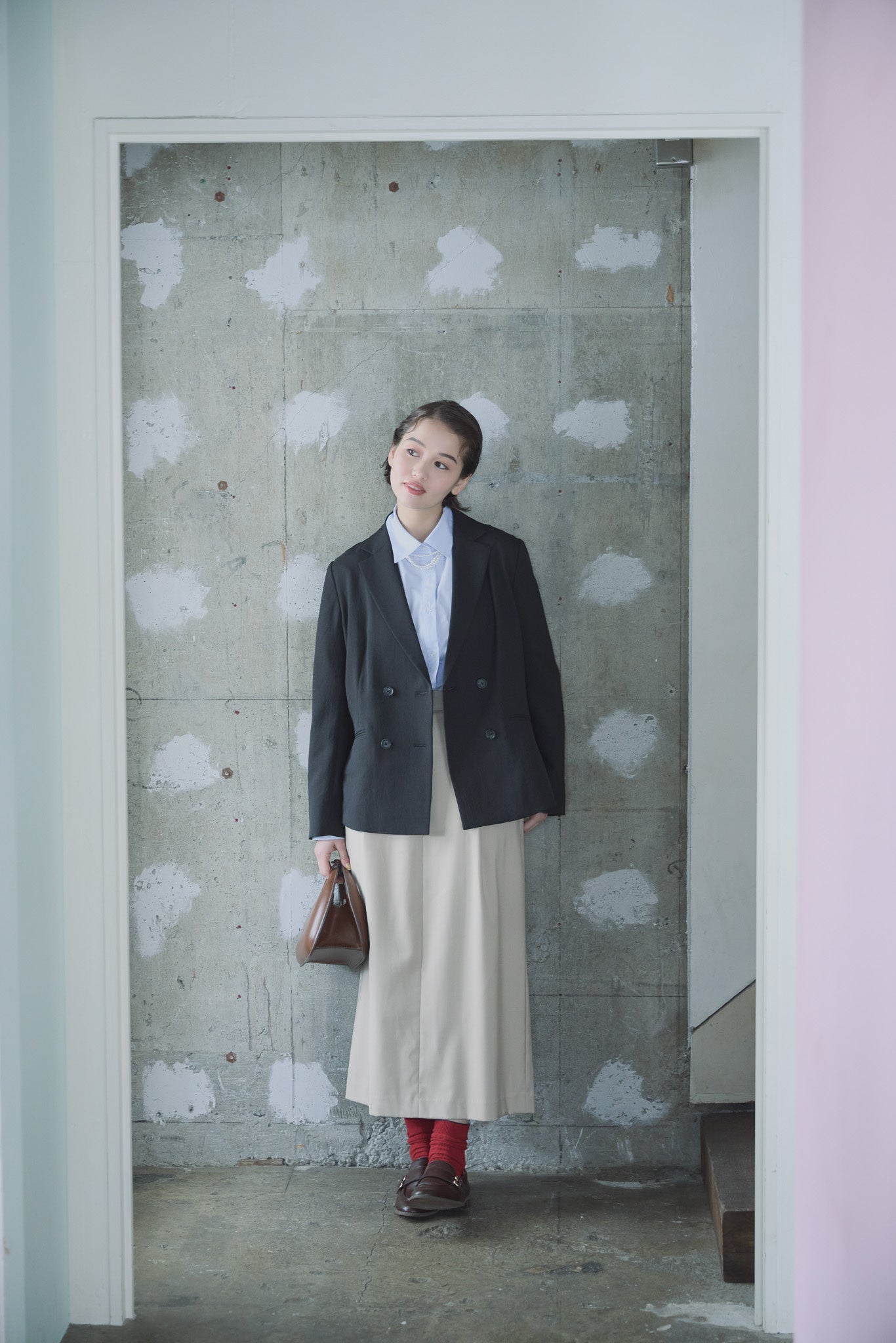 ジャケットにブルーシャツを合わせれば、トラッド感溢れるスタイルにチェンジ。時にはこんなガーリーな気分で。もちろん着心地の良さも諦めない。