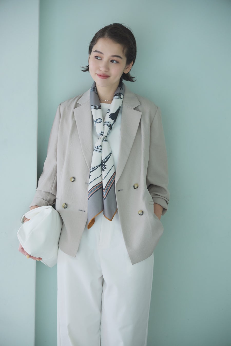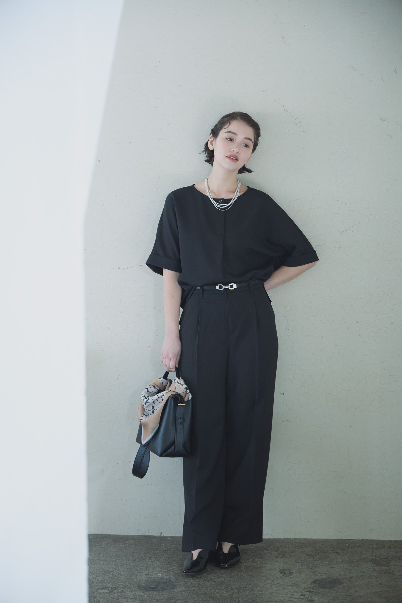 ブラウス&パンツをセットアップで着たら、オールインワン風のきれいめスタイルに。同じく、接触冷感、UVカット、吸汗速乾の夏も快適な機能素材で真夏まで着られるスタイル。