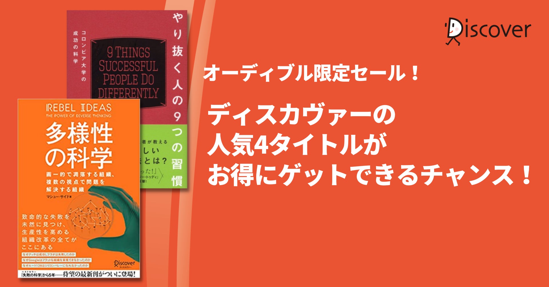 10/2よりオーディブルにて、『多様性の科学』(マシュー・サイド 著)をはじめとしたディスカヴァーのベストセラー4点がお得にゲットできるセールを開催します。