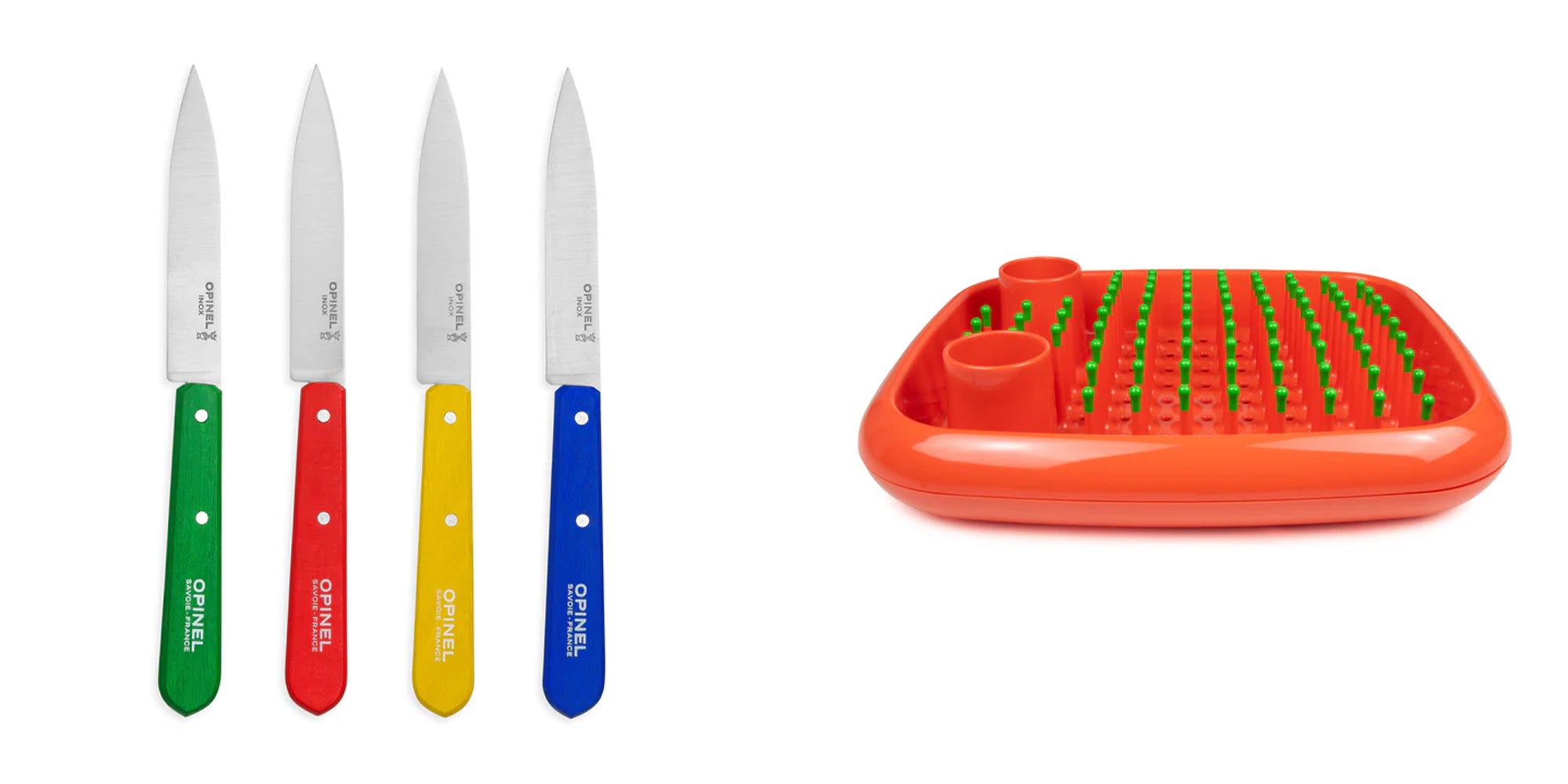 税込価格 ¥5,500フランスの有名なカトラリーブランド、Opinel(オピネル)のナイフ4本セット。鮮やかなカラーのグリーン、レッド、イエロー、ブルーのハンドルで皮むき作業が楽しくなります。シェフナイフよりも小さく短めで、皮むきのほか、パイやデザート用のリンゴなどのフルーツ、マッシュルーム、エシャロット、にんじん、かぶなど小ぶりな野菜を切るのに最適です。ステンレススチールの刃で正確にカットでき、カラフルなシデ材のグリップ部分は水気や汚れから保護するためにニスを施しています。一生モノのキッチンツールとして使っていただけるナイフです。