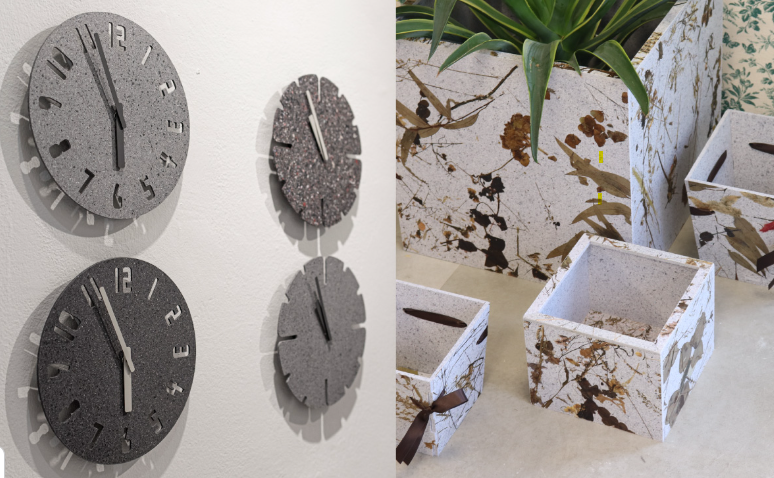 アパレル企業から回収した廃棄衣類や製造工程で発生する端材などの繊維素材をボードとして美しく再資源化。店舗什器やオフィス家具に生まれ変わらせます。