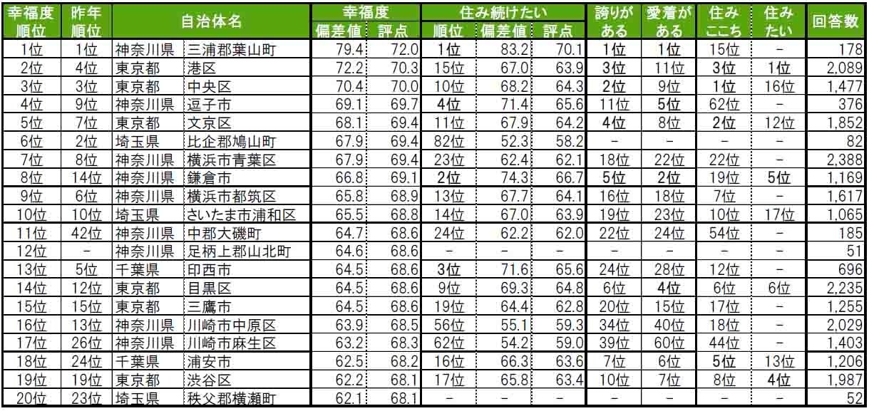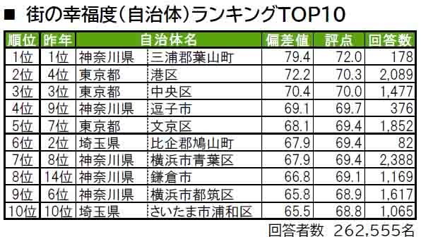 ■街の幸福度(自治体)トップは、2年連続で神奈川県三浦郡葉山町