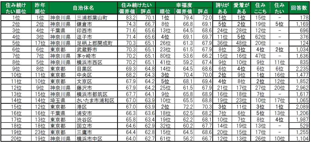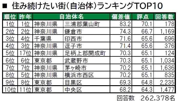 1位は4年連続で神奈川県三浦郡葉山町で、唯一偏差値80台の極めて高い評価を得ています。2位は、3年連続で神奈川県鎌倉市です。3位は千葉県印西市で、昨年4位から一つ順位を上げました。トップ10内では、5位の神奈川県足柄上郡開成町が、昨年17位から順位を上げてトップ5入りしています。