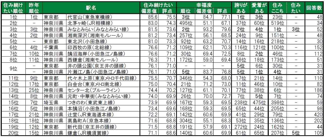 ●1位~5位の駅は偏差値80台の極めて高い評価、6位~20位の駅は偏差値70台で相対的に高い評価となっています。