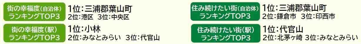 •「街の幸福度(駅)・住み続けたい街(駅)」は、駅徒歩15分以内に居住している回答者が30名以上の駅を、「街の幸福度(自治体)・住み続けたい街(自治体)」は、回答者50名以上の自治体を対象として集計しています。