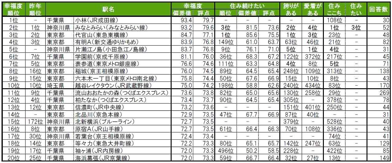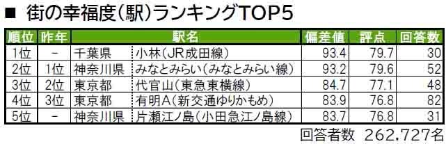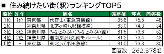 印西市に位置する小林が初登場で1位にランクインしています。2位は横浜市西区に位置するみなとみらいで、「住みここち」をはじめとする全てのランキングでトップ4以内に入る高い評価を得ています。3位は、渋谷区に位置する代官山です。5位には、片瀬江ノ島は初登場でトップ5入りしています。1位小林と5位の片瀬江ノ島は、昨年累計回答者数が30名未満でランキング集計対象外だった駅です。