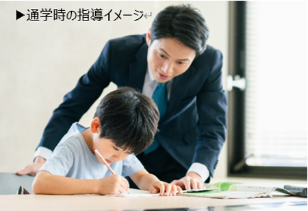 子どもは、週2日登校、週2日在宅でのオンライン通学というスケジュールで学び、教科の基本的な学習には進研ゼミのタブレット教材を活用。進研ゼミの「各教科書に対応し、学習指導要領に則した5教科学習が行える」という特性を活かし、タブレットの学習履歴データを出席証明に活用します。