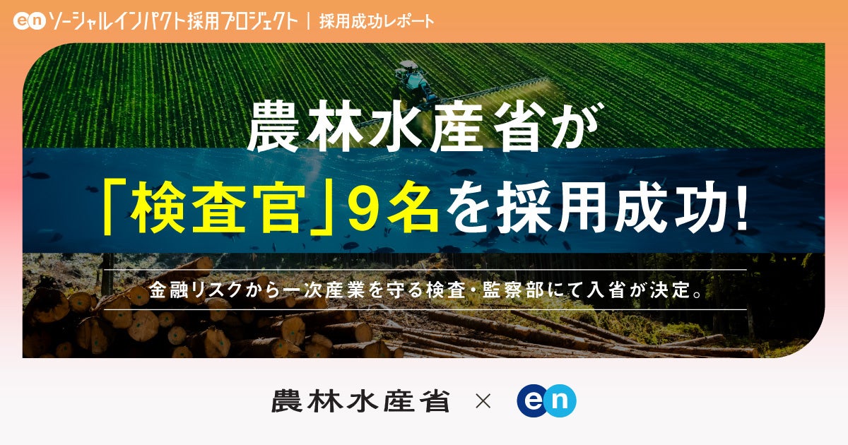 農林水産省 大臣官房検査・監察部検査課、エンの『ソーシャルインパクト採用プロジェクト』で400件以上の応募から「検査官」9名の採用が決定