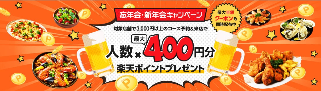 本キャンペーンでは、対象の飲食店でランチ1,500円以上、ディナー3000円以上のコースを2名以上でネット予約・来店すると、ランチは人数×最大140ポイント(プレミアム会員でアプリ予約した場合は最大180ポイント)、ディナーは人数×最大400ポイント(※1)の「楽天ポイント」が進呈されます。さらに、コース予約で会計金額から最大6,000円OFFになるネット予約クーポンを発行。ポイントを獲得しながらお得に忘年会・新年会を楽しむことができます。