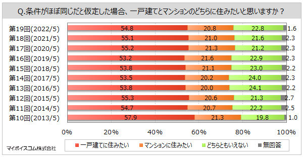 マイボイスコム株式会社(東京都千代田区、代表取締役社長:高井和久)は、19回目となる『マンションのブランド』に関するインターネット調査を2022年5月1日~5日に実施し、10,122件の回答を集めました。調査結果をお知らせします。