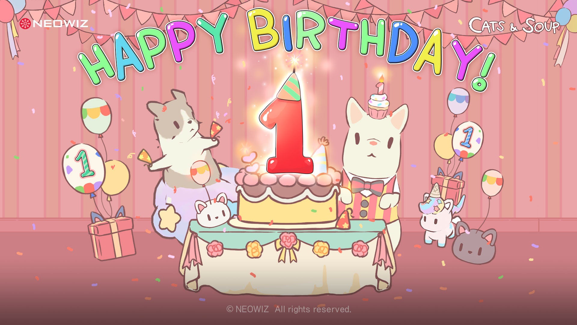 株式会社NEOWIZ(本社:韓国 京畿道城南市、共同代表:金 承徹(キム・スンチョル)/裵 泰根(ベ・テグン)がサービス中の癒し系放置型ゲーム『猫とスープ(Cats&Soup)』(開発:ハイディア (代表キム·ドンギュ))は、本日2022年9月8日(木)よりリリース1周年を記念した誕生日パーティーコンセプトのイベントを開始いたします。