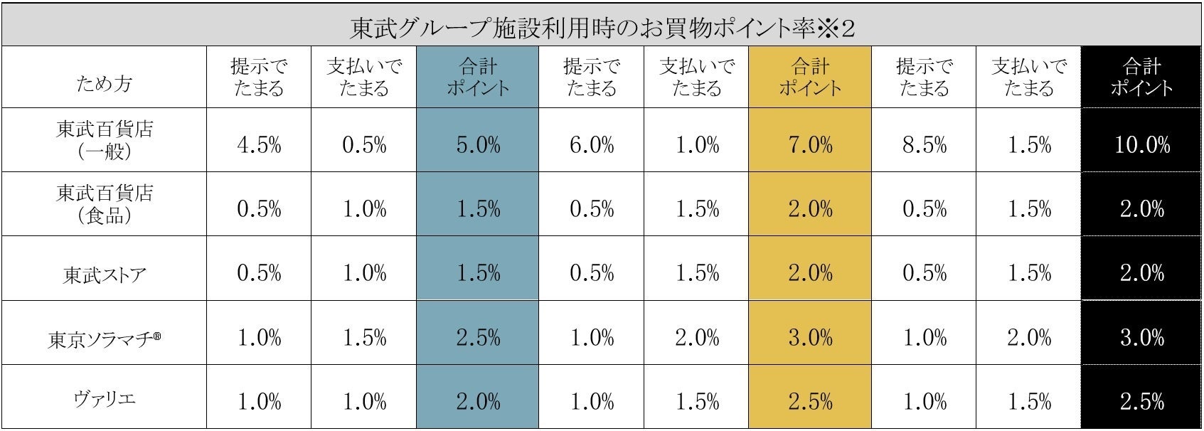 ※2:合計ポイントは、提示と東武カード決済の合算値であり、最大料率を表記しています。なお、提示によるポイントと東武カード決済によるポイントの付与タイミングは異なり、提示でたまるポイントが付与されるお支払い方法は施設によって異なります。