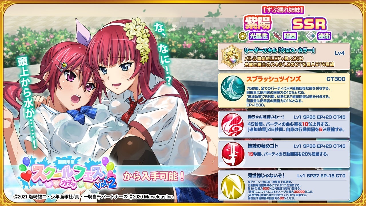 本日から始まる「スクールフェスガチャVol.2」では、新たに「【ずぶ濡れ姉妹】紫陽」(CV:津田美波)」が登場。