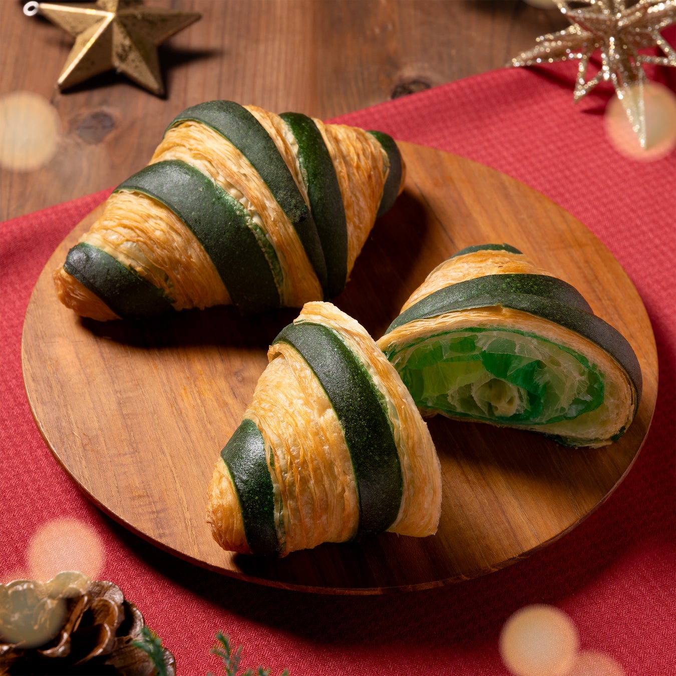 クロワッサンで香り豊かなピスタチオフィリングを包み、ピスタチオの生地と巻き込んで仕上げました。