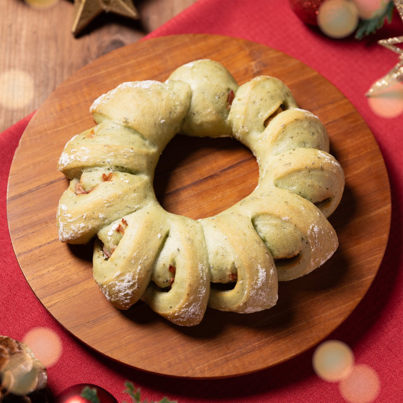 バジルとチーズが香るジェノベーゼソースを練り込んだフランスパンをリース型にして、ベーコンを包みました。