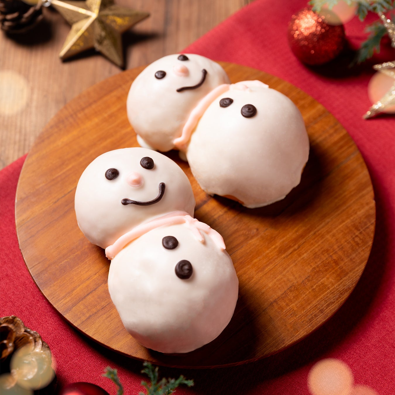クグロフ生地にカスタードを絞り、ホワイトチョコをコーティングして可愛らしい雪だるま形に仕上げました。