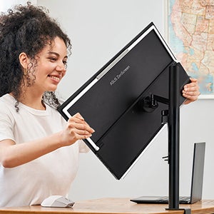 キックスタンドを兼ねたキャリーハンドルを搭載されており、モニターをさまざまな角度で支えて快適に視聴することができます。Z軸調整のアームや、さまざまな配置に対応するするフックキットで机上のスペースを最大限に活用できます。