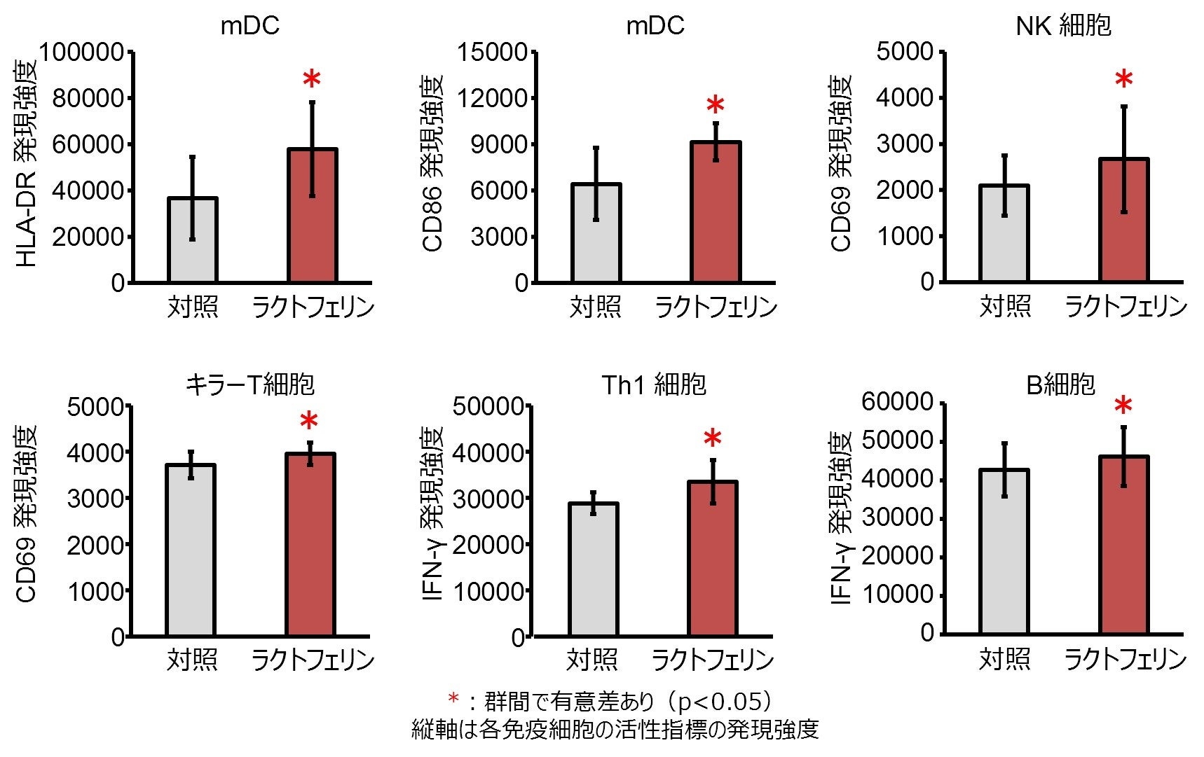 IFN-αは、自然免疫系、獲得免疫系の幅広い免疫細胞を活性化することが知られています。ラクトフェリンはpDCの活性化とIFN-αの産生を亢進することから、単核球に含まれる他の免疫細胞の活性化も亢進することが期待されました。そこでTLR7刺激下で単核球を培養する際にラクトフェリンを添加したところ、ミエロイド樹状細胞(mDC)、ナチュラルキラー(NK)細胞、キラーT細胞、ヘルパーT1(Th1)細胞、B細胞の活性化が亢進しました(図4)。以上のことから、ウイルス由来の1本鎖RNAを認識するTLR7が刺激される状況において、ラクトフェリンはpDCだけでなく、pDC下流の幅広い免疫細胞の活性化も亢進することが示されました。