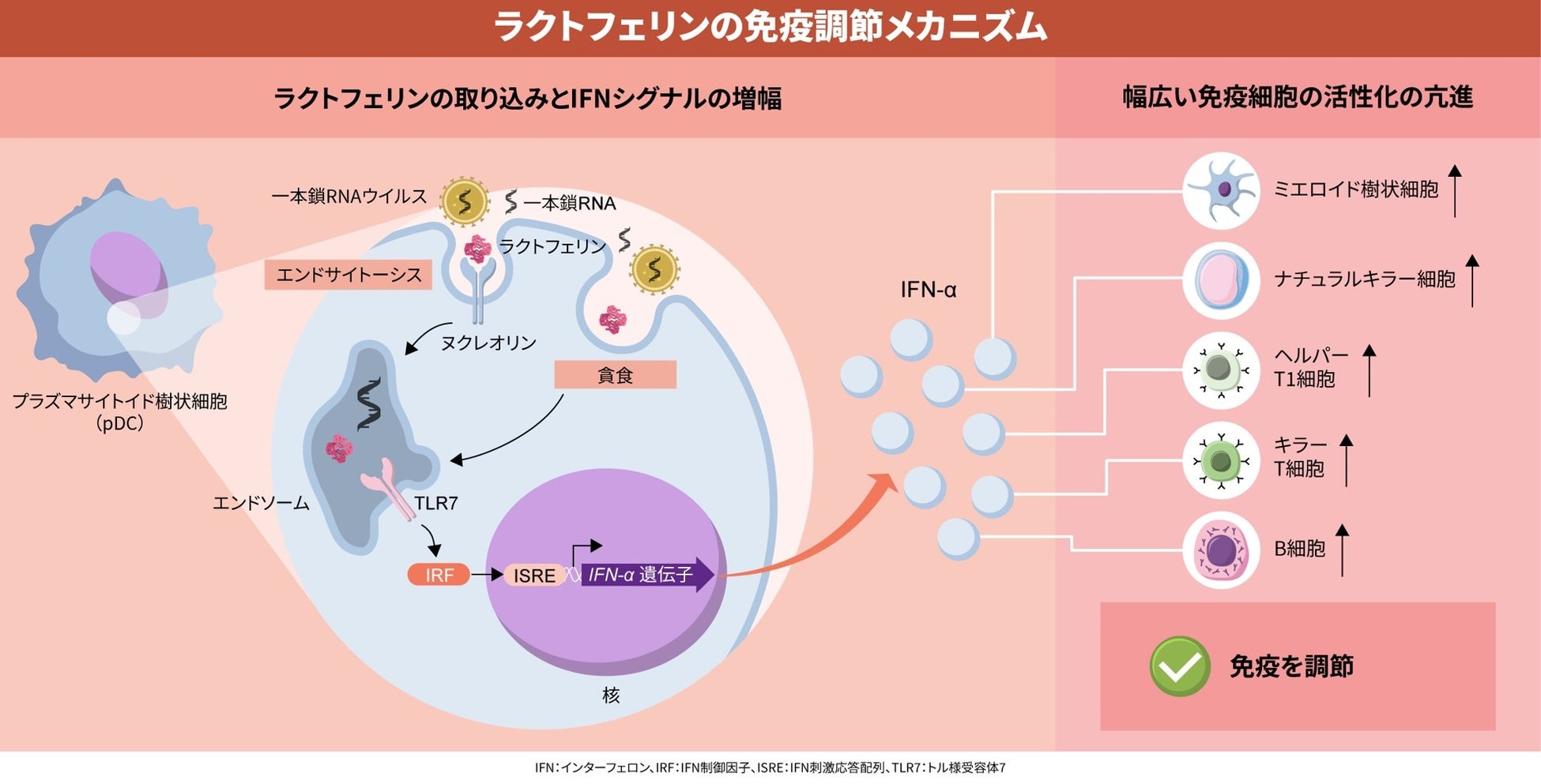 以上より、ラクトフェリンは貪食やラクトフェリン受容体のヌクレオリンを通してpDCに取り込まれ、ウイルス由来の1本鎖RNAを認識するTLR7の感受性を高めることで、pDCの活性化とIFN-αの産生を亢進し、下流のmDC、NK細胞、キラーT細胞、Th1細胞、B細胞などの自然免疫系、獲得免疫系の幅広い免疫細胞の活性化も亢進することで、免疫を調節することが示唆されました。
