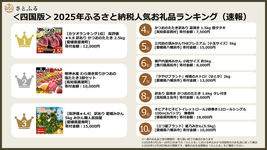 ふるさと納税ポータルサイト「さとふる」を運営する株式会社さとふる(本社:東京都中央区、代表取締役社長 兼 CEO:藤井 宏明)は、「さとふる」における<四国版>2025年人気お礼品ランキング(速報)(※1)を発表します。
