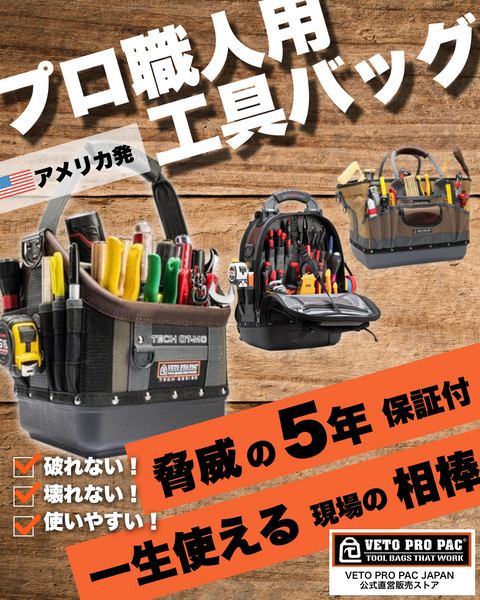 全品5年保証!アメリカ発のプロ専用工具バッグブランド”VETO PRO PAC(ベトプロパック)”電気工事士、設備士、大工、など、幅広い職人様に適した超頑丈かつ機能的バッグ。