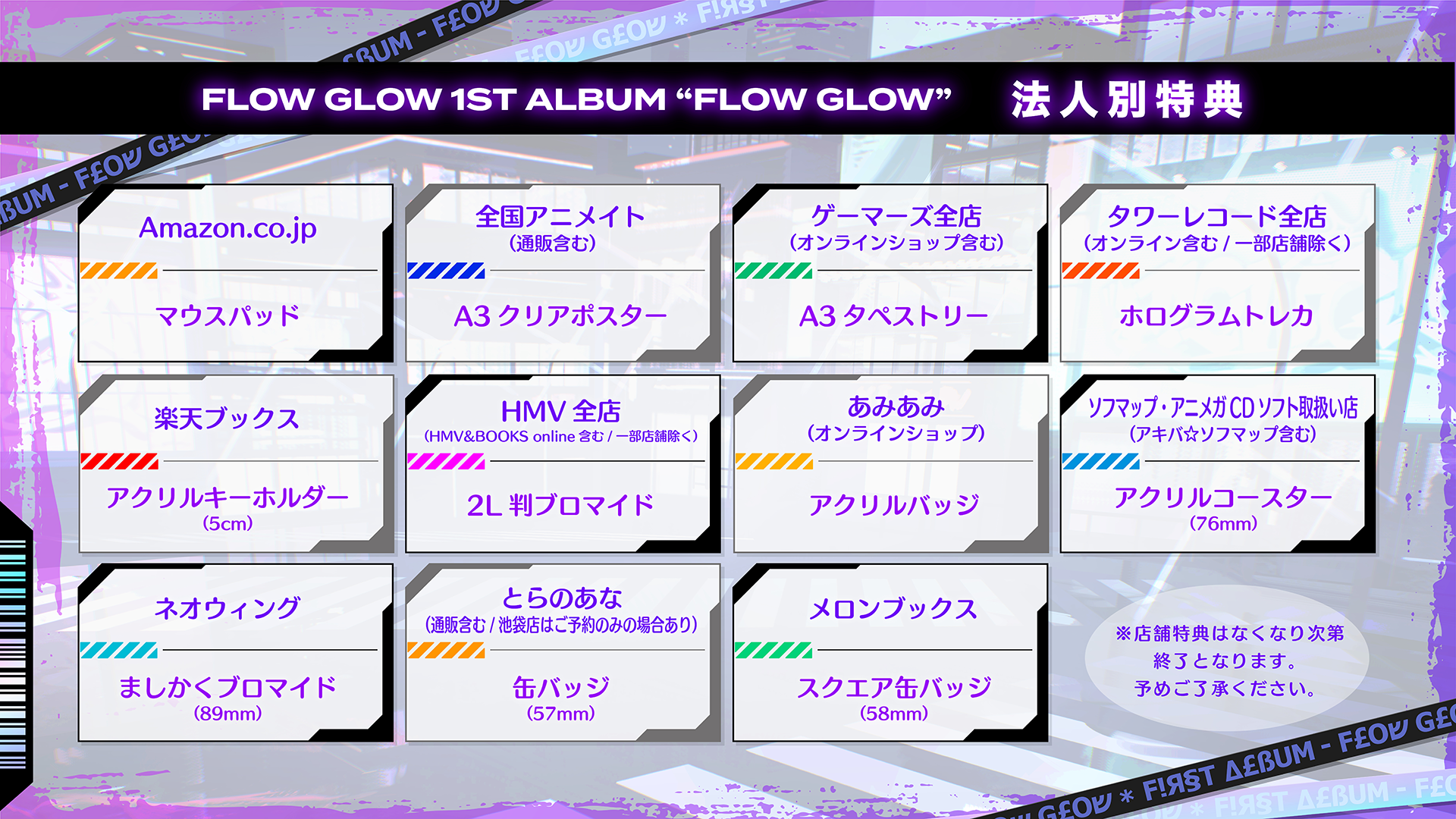 下記販売店にて『FLOW GLOW』通常盤 TYPE-B(初回生産分)をお買い上げのお客様に先着で法人別購入特典を差し上げます。