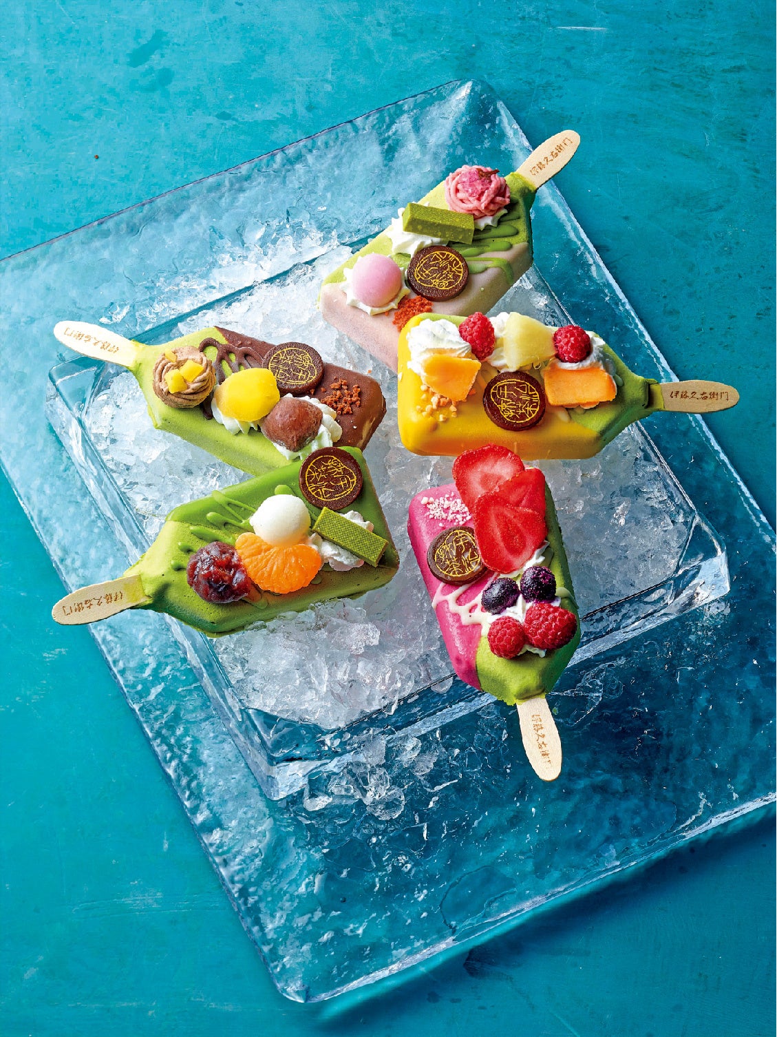 京都・宇治。伊藤久右衛門の抹茶パフェを手軽に食べられるアイスバーに。いちご、さくら、トロピカル、モンブランの季節の味わいを詰め合わせました。