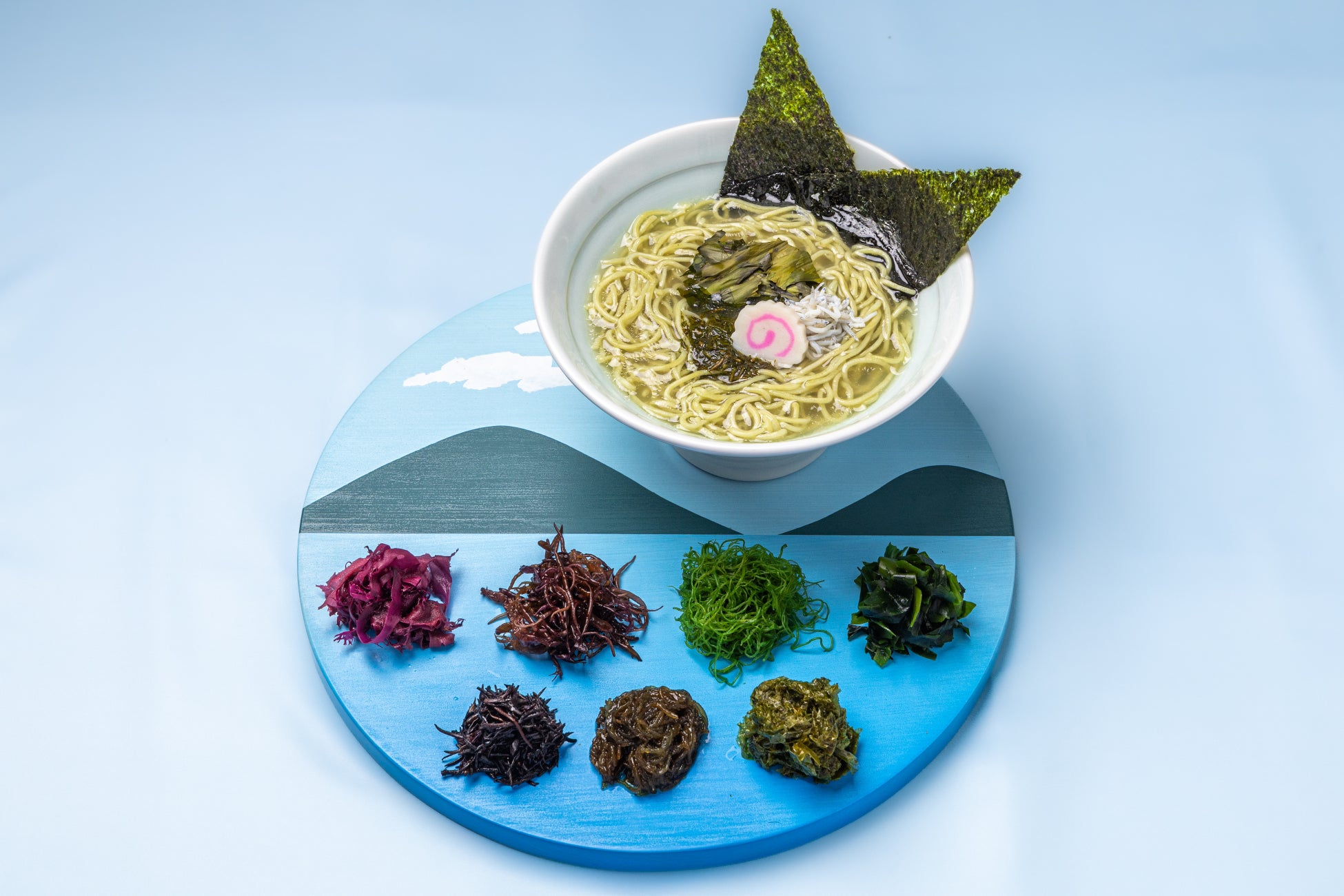 海の中を観察した後は、伊豆半島でこれまでに生息が確認されている海藻を使用してラーメンを作ります。わかめが練りこまれた麺の上に、「とさかのり」や「はばのり」など、様々な色や形、食感の10種類の海藻をトッピング。海藻をスープと一緒に味わうことで、磯の香りが口いっぱいに広がります。海藻の粘り気や食感の違いから、種類の豊富さやそれぞれの海藻が持つ特徴について知ることができます。