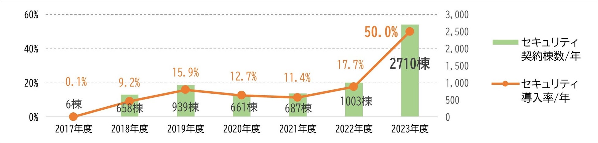 当社は、2017年2月に初めて防犯優良賃貸の認定を取得して以降、当社オリジナルの防犯ブランド「DK SELECTセキュリティ」を展開しています。2023年3月からは、スマートフォン接続により「中を見守る」IoTインターホンの設置を追加し、セキュリティサービス導入率は2024年3月末で50%となっています。