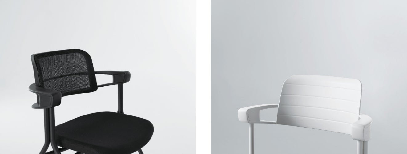 肘から伸びるアイコニックなループ形状は、空間に水平基調で洗練されたデザインをもたらします。背樹脂タイプはファブリックを思わせるステッチラインが、柔らかい雰囲気を演出します。