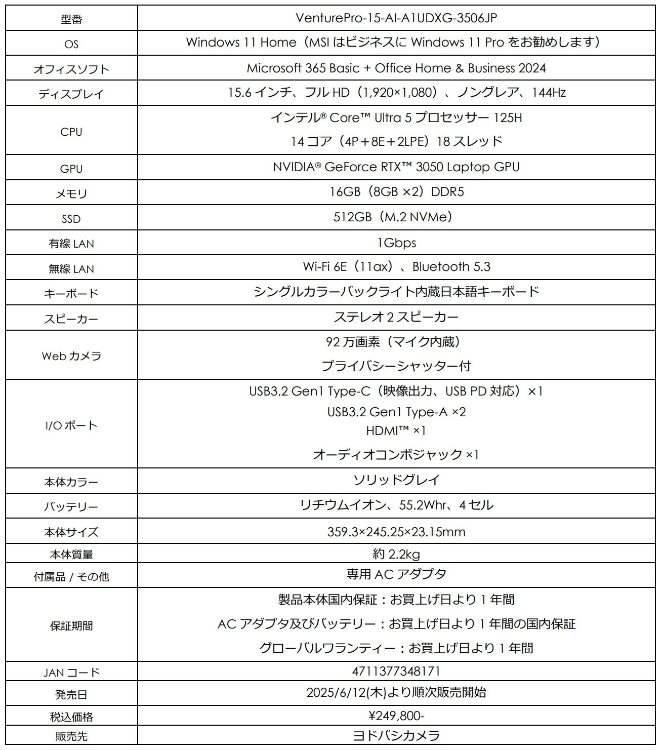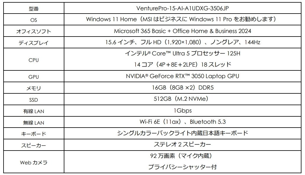 この度、エムエスアイコンピュータージャパン株式会社は、MSIビジネスノートPCシリーズのラインアップを強化するべく、1シリーズで幅広いニーズに対応できる新しいビジネスノートPCとして開発された「VenturePro」シリーズより、「GeForce RTX™ 3050 Laptop GPU」と「Microsoft 365 Basic + Office Home & Business 2024」を搭載したヨドバシカメラ限定モデル「VenturePro-15-AI-A1UDXG-3506JP」を2025年6月12日(木)より順次発売いたします。
