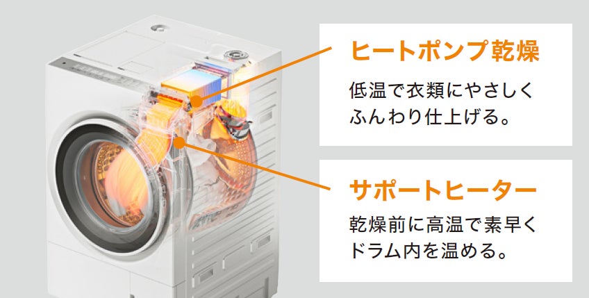 ヒートポンプ式乾燥は、低温で衣類をやさしく乾燥させることで、衣類へのダメージを抑えながら電力消費を削減する一方で、乾燥に時間がかかるという課題がありました。今回新たに搭載したサポートヒーターは、乾燥前にドラム槽内を効率的に加温することで、乾燥効率を高め、よりスピーディな乾燥を可能にします。
