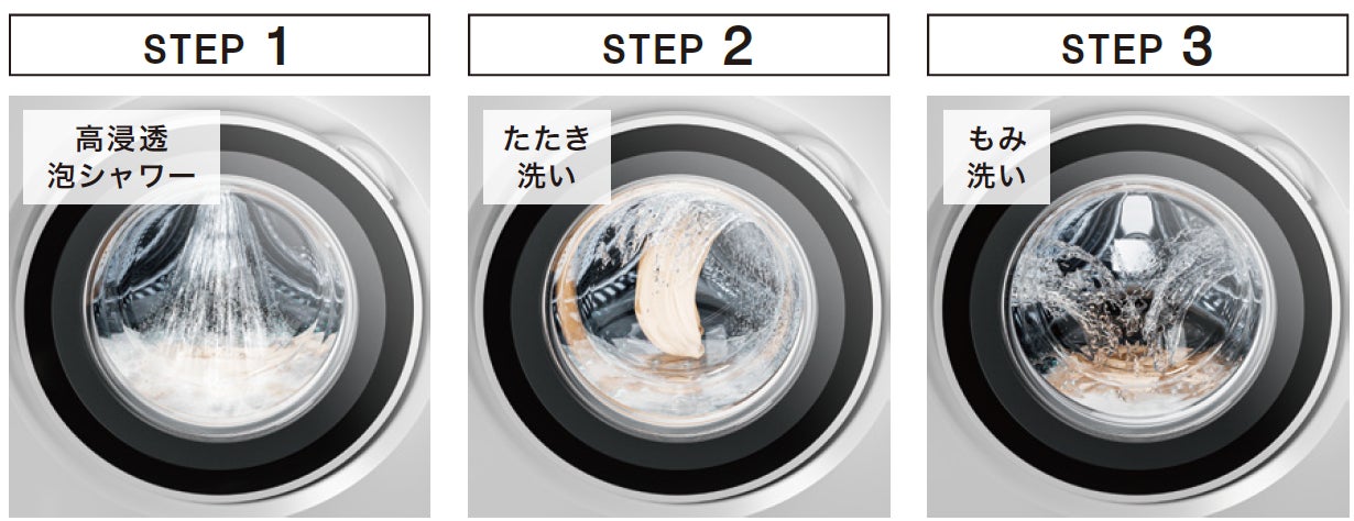 (※1)洗濯3kg時、標準コース(高浸透泡シャワー洗浄ON時)において、(水温20℃、粉末洗剤使用)当社実験による。衣類の汚れや洗剤の種類、量、洗濯水の硬度や水温によって効果は異なります。