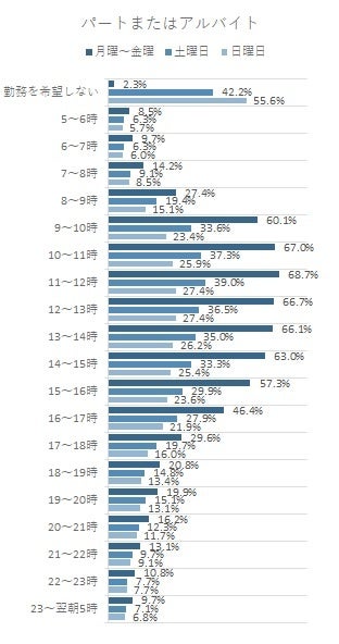 「パートまたはアルバイト」を希望する人では、「勤務を希望しない」日が「土曜日」は42.2%、「日曜日」では55.6%だった。正社員希望の人と比べるとその割合は低いものの、土日での勤務は避けたいと思う人が多いようだ。