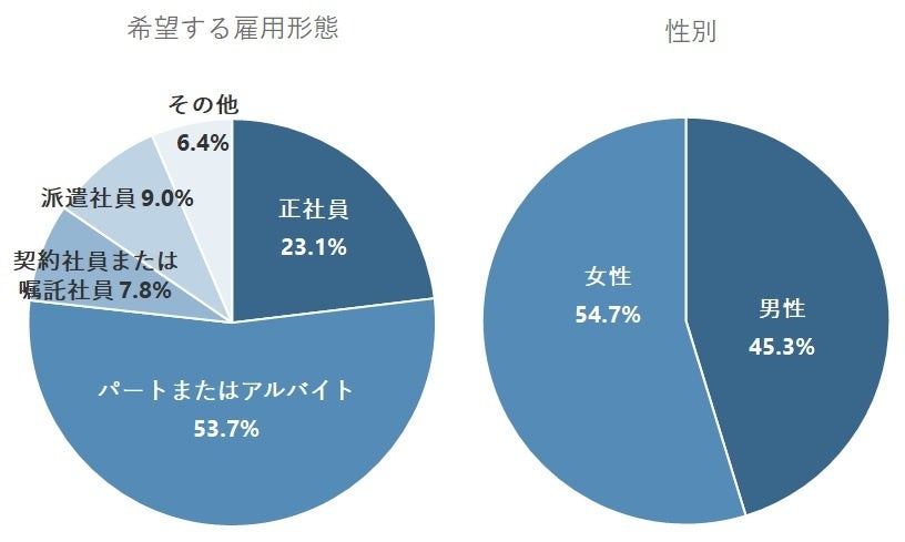 「正社員」での雇用を希望する人では、「勤務を希望しない」日が「日曜日」に74.8%、「土曜日」では58.9%だった。半数以上の人が、少なくとも土曜日か日曜日は休業の仕事を希望している。