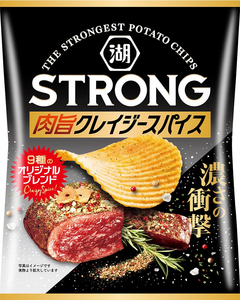 「湖池屋STRONG ポテトチップス 肉旨クレイジースパイス」は、9種のスパイスと岩塩を使用し、牛肉の旨みをキレよく引き立てた、やみつきになる味わいです。