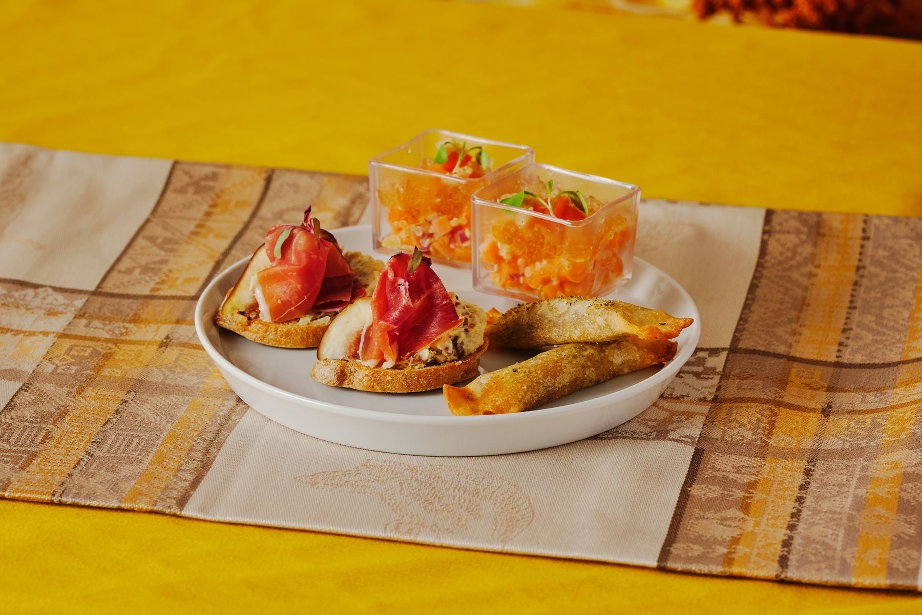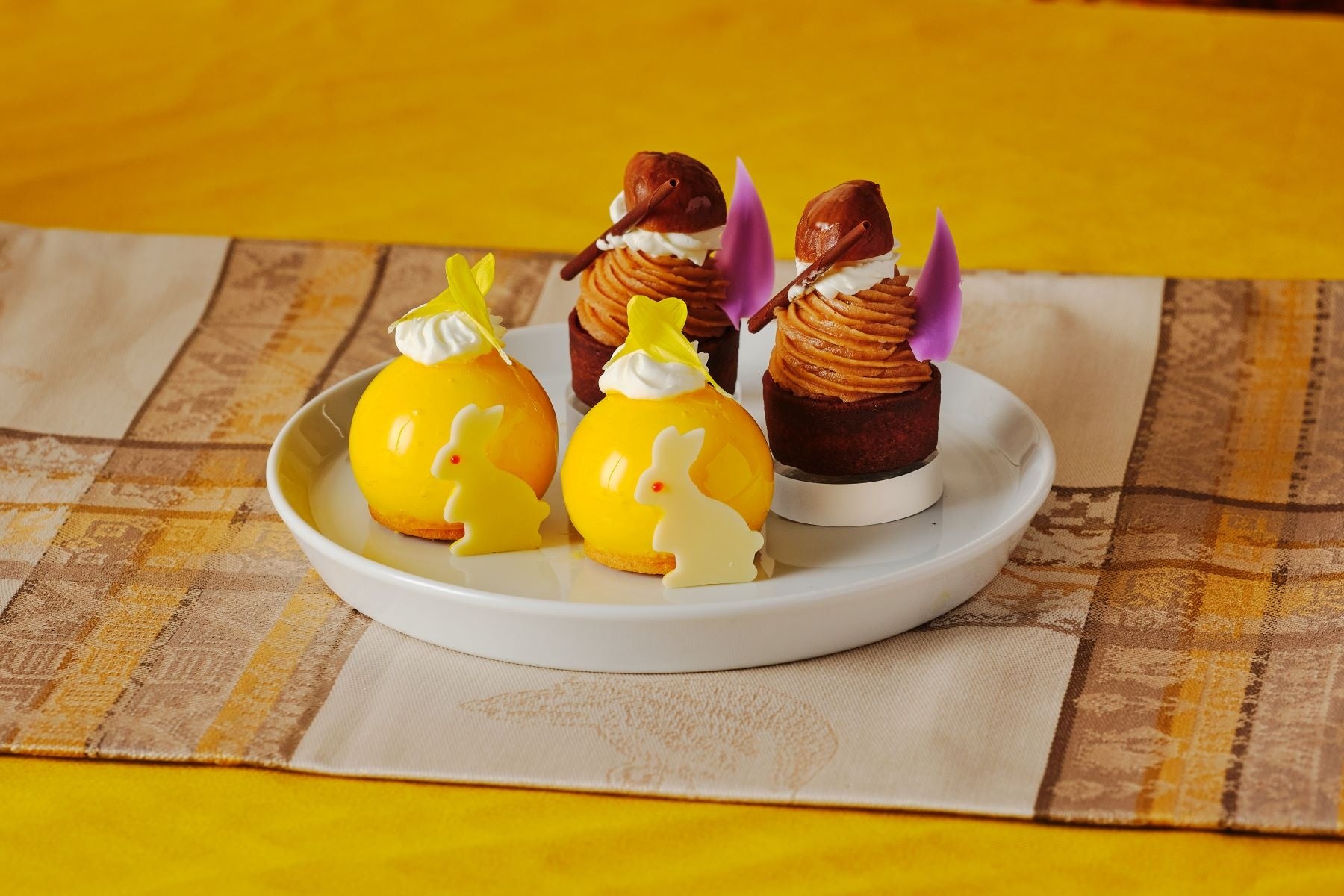 柚子餡と白餡の2色団子や、栗と餡子を合わせたうさぎ型最中をはじめ、うさぎが満月を見上げている様子を表現した柚子ムース、栗の風味と様々な食感が楽しめるモンブランタルト、カシスの酸味とオレンジの甘味が調和したムース、紫芋餡とバター、ウイスキーのクリームを挟んだマカロンなどスイーツ6種。セイボリーは、サーモンマリネとスーパーフードのキヌアを酸味が効いたロゼスパークリングジュレと合わせたサラダや、茸のフリカッセにバジルとコリアンダーのパウダーがアクセントになったワンハンドで召し上がれる一品、生ハムとイチジクを乗せた甘栗とナッツのチーズディップのブルスケッタなど、秋の味覚をお楽しみいただける3種をご用意。