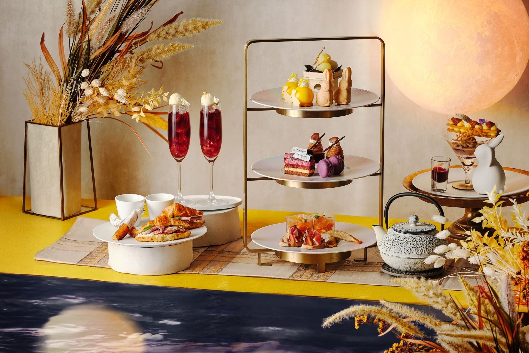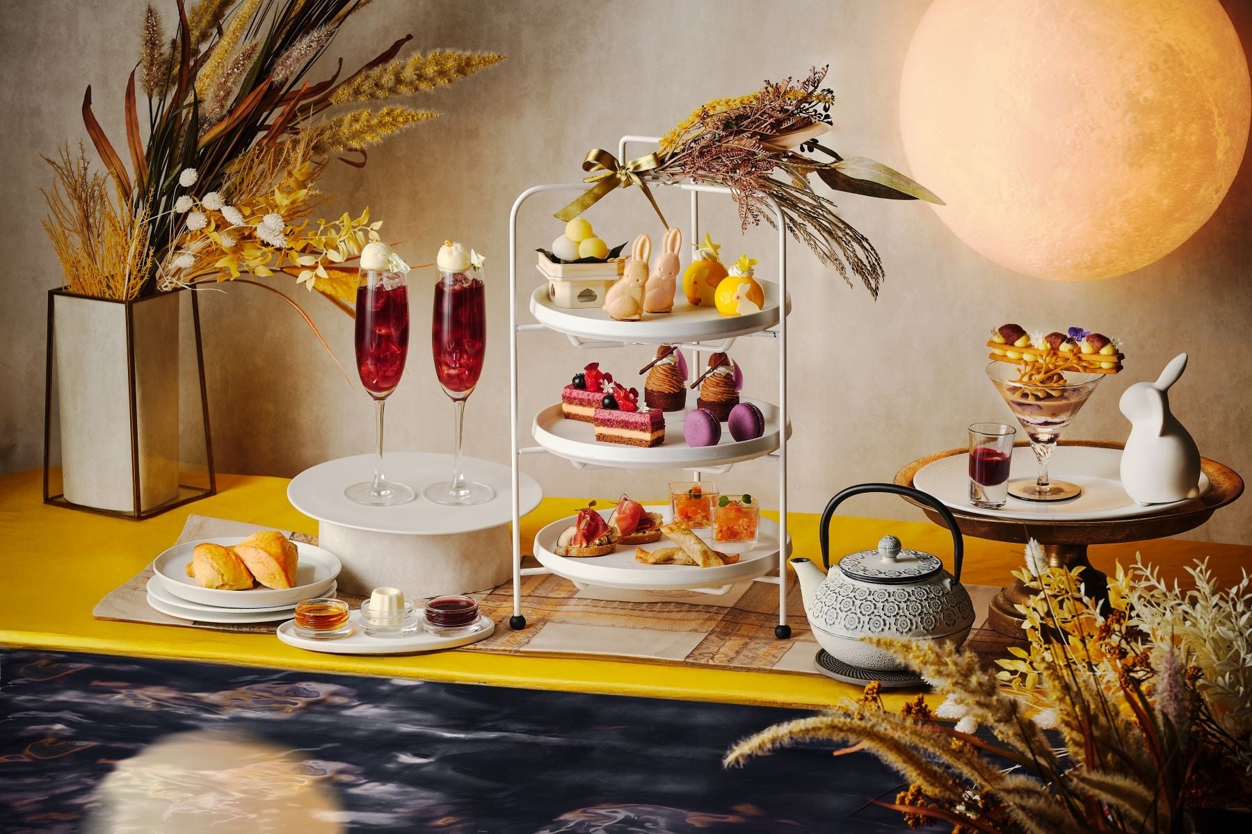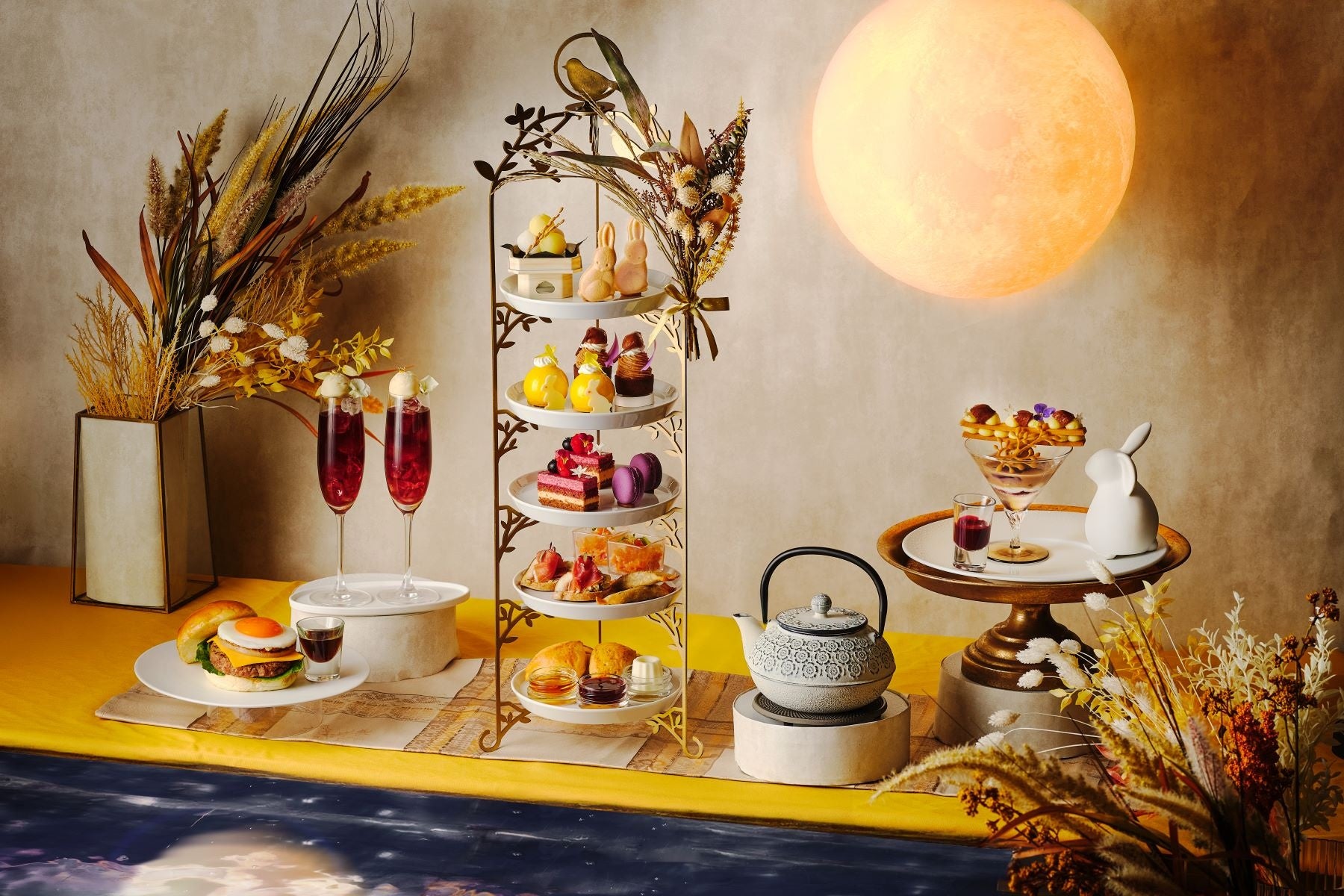■「お月見アフタヌーンティー」には、栗や紫芋など秋の味覚を用いた“お月見スイーツ”が勢揃いし、満月やうさぎなど、お月見気分を盛り上げるビジュアルのメニューを楽しめます!