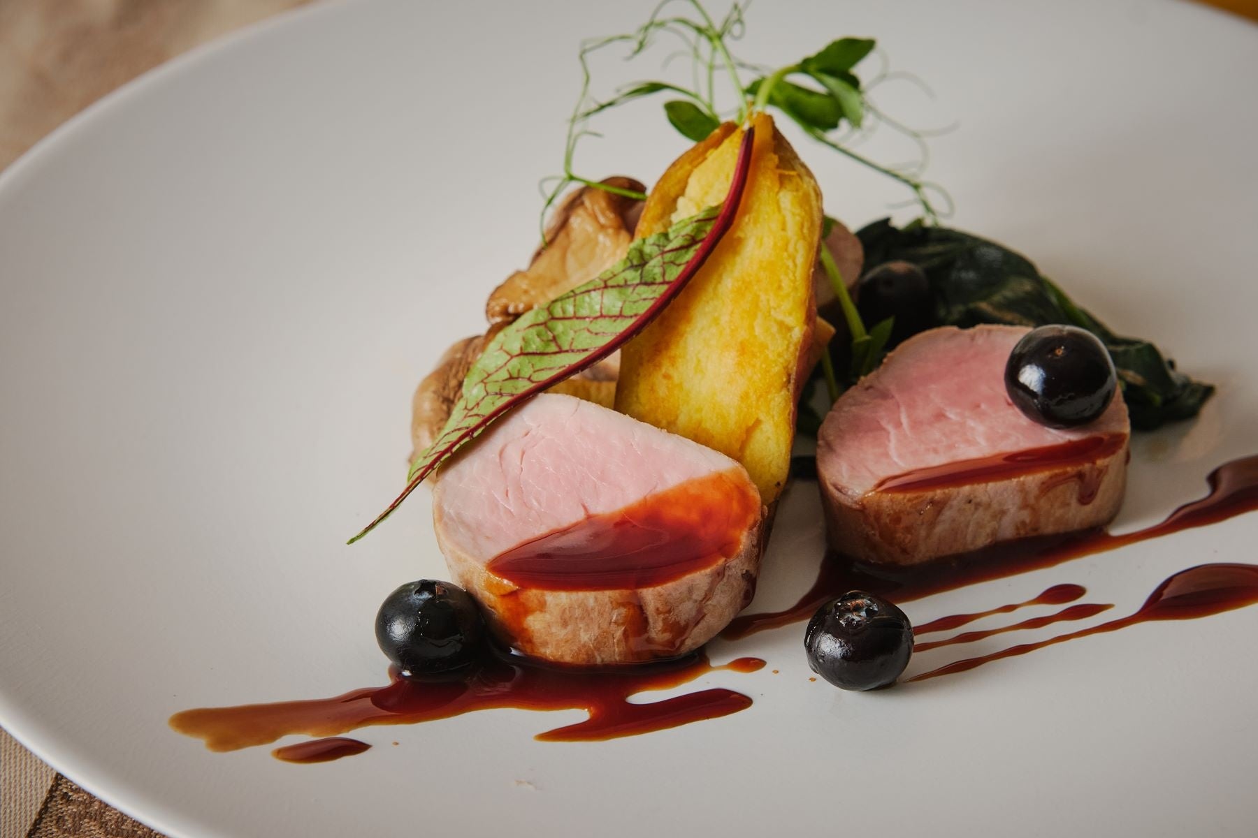 ・ポークランチ(カボチャのポタージュ ナッツのアクセント/国産豚フィレ肉のポワレ 赤ワインと