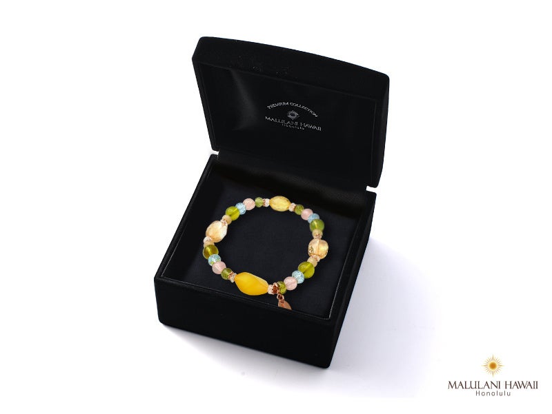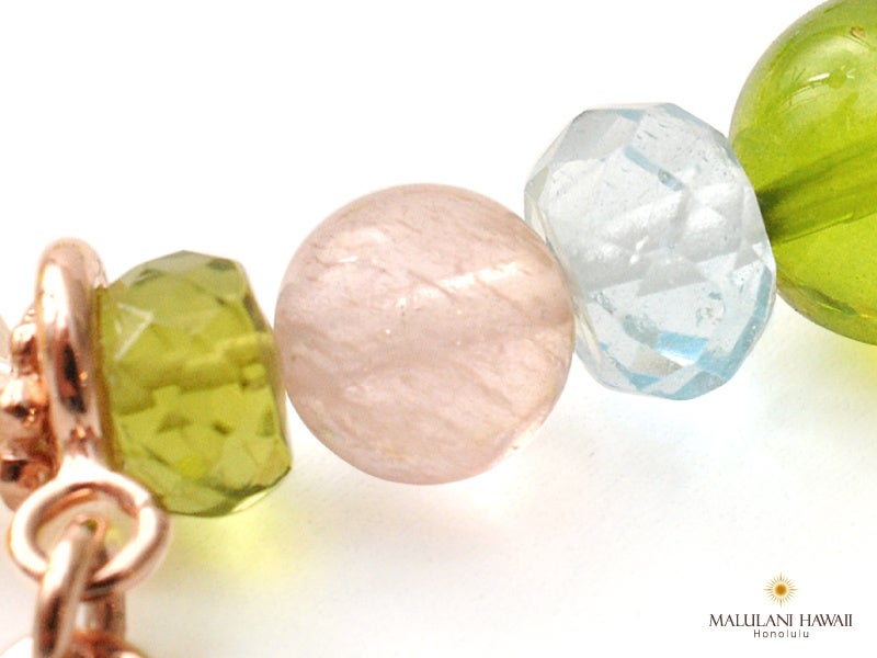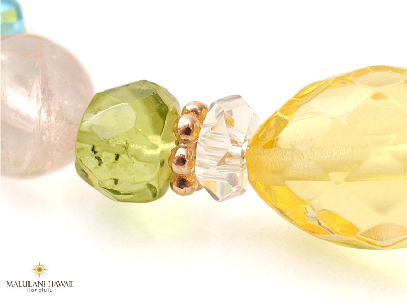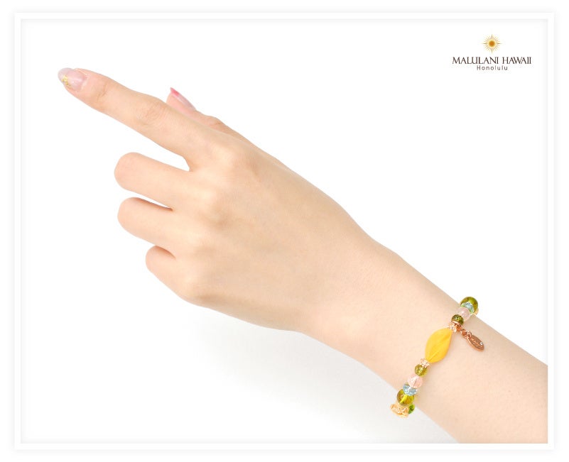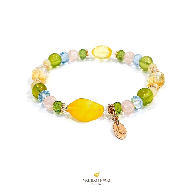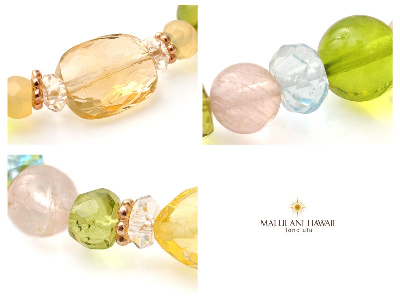 太陽神を象徴する3種の石、ペリドット、シトリン、ブルートパーズと、柔らかな愛の石、モルガナイトを組み込んだ、優しい波動が特徴のブレスレット。パワーストーンに願いを込めながら、毎日のお守りとしてお持ちいただけます。